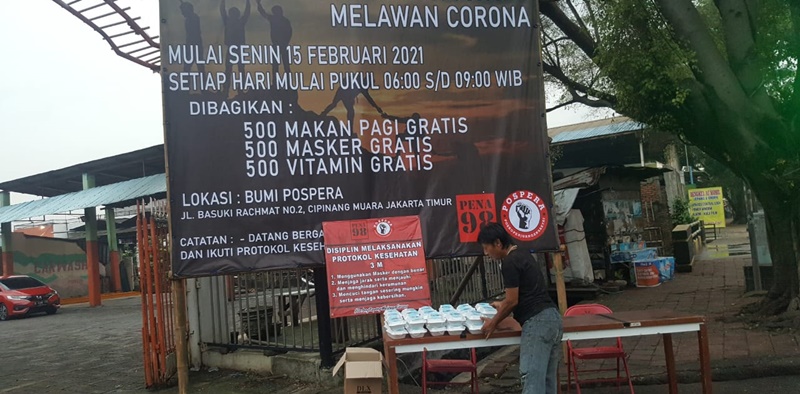 Dengan mengikuti Protokol kesehatan (datang bergantian, menjaga jarak dan memakai masker), PENA 98 dan POSPERA yang setiap harinya akan membagikan 500 makan Ppagi gratis, 500 masker gratis, 500 Vitamin B dan C gratis, yang dimulai hari Senin 15 Febuari 2021 Pukul 06.00 sampai 09.00 WIB, bertempat di Bumi  POSPERA Cipinang Muara.