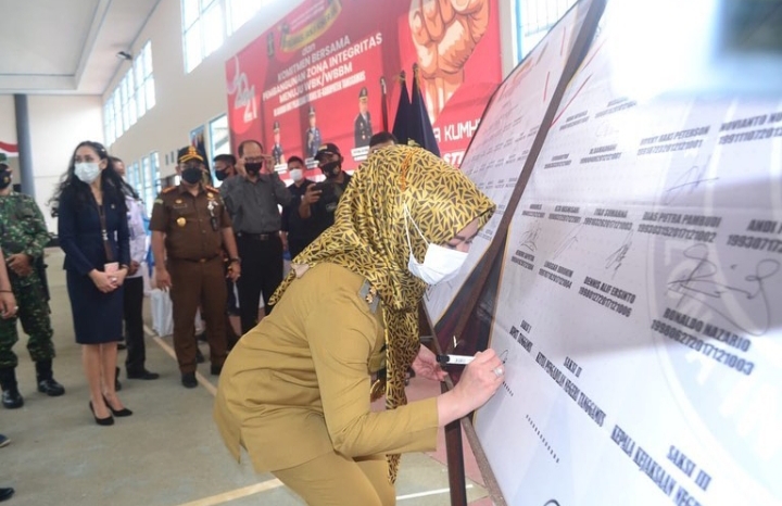 NUSANTARA-NEWS.co, Kotaagung Barat –– Bupati Tanggamus Hj. Dewi Handajani, menghadiri sekaligus menyaksikan Penandatanganan Deklarasi Janji Kinerja serta Pencanangan pembangunan Zona Integritas menuju WBK (Wilayah Bebas Korupsi) dan WBBM (Wilayah Birokrasi Bersih Melayani) Tahun 2021 di Aula Lapas Kelas II B Kotaagung Barat, Selasa (23/02/2021).