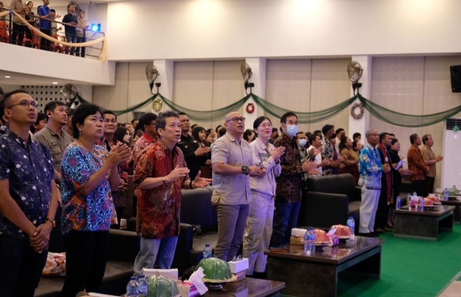 Perayaan ibadah Natal di Gereja Oikoumene IMIP berlangsung aman, tenteram, dan meriah. Sebagian umat datang bersama anggota keluarga, saudara, dan anak-anak. Dalam khotbahnya, Pendeta James Anderson Lola, M.Th. S.Th merumuskan makna penting hidup damai sejahtera sebagai pemulihan hubungan rusak akibat dosa.