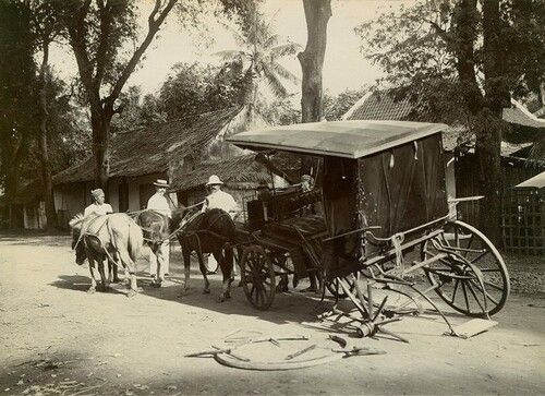 Potret kecelakaan kereta kuda dimana roda kiri kereta patah. Potret ini diambil di daerah Pekalongan antara tahun 1907-1920.