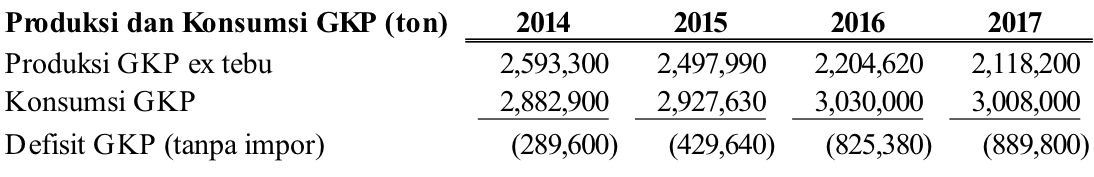 Defisit gula (kristal putih), atau GKP, nasional semakin lama semakin membesar. Defisit produksi gula tahun 2014 hanya 289.600 ton. Kemudian defisit naik terus menjadi 429.640 ton pada 2015, 825.380 ton pada 2016, dan 889.800 ton pada 2017. Lihat tabel.