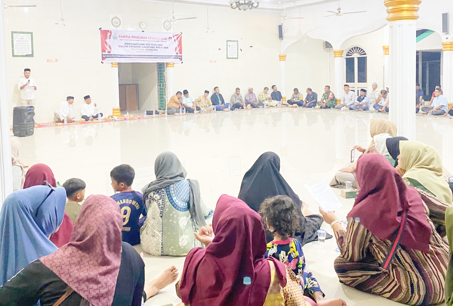 Nusantaranews. co. Bireuen – Panitia Pemilihan Keuchik (P2K) Gampong Pulo Ara Geudong Teungoh Kecamatan Kota Juang, Kabupaten Bireuen, menggelar penyampaian visi misi calon Keuchik (Kepala Desa) di komplek Meunasah Gampong Pulo Ara Senin, 25 Agustus 2025 ba’da Shalat Insya pukul 21.00 WIB.
