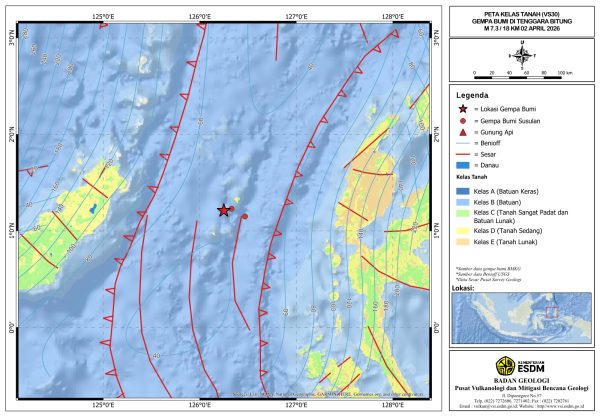 “Pada 2 April 2026 pukul 05.48.14 WIB telah terjadi gempa bumi di perairan Laut Maluku, dengan pusat gempa di 1,21?LU-126,25?BT. Berdasarkan informasi BMKG, gempa ini memiliki magnitudo M7,3 pada kedalaman 18 km. Guncangannya terekam di Pos PGA Dukono dan Ambang pada skala III MMI, Karangetang pada skala III-IV MMI, serta Tangkoko dan Mahawu pada skala IV-V MMI,” ujar Pelaksana Tugas (Plt) Badan Geologi Kementerian ESDM Lana Saria di Bandung, Rabu (2/4).