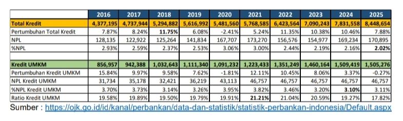 Terlihat bahwa selama 10 tahun terakhir, total pertumbuhan kredit dominan dibawah 10%, bahkan sempat terkoreksi pada tahun 2020, sebagai dampak pandemi Covid 19. Pada tahun 2025, total kredit bertumbuh 7,88% namun untuk kredit UMKM terkoreksi -0,27%. Apakah karena kurangnya permintaan kredit UMKM, sehingga pertumbuhannya turun? Kalau dilihat dari pengambilan data Sistem Layanan Informasi Keuangan (SLIK) yang lebih dikenal dengan BI Checking, sesuai data OJK ditahun 2024 ada 22,638,302 pengambilan data dan pada tahun Oktober 2025 ada 31,508,512 pengambilan data SLIK. Ini menunjukkan bahwa permintaan kredit cukup tinggi, dan dapat diasumsikan terjadinya banyak permohonan kredit yang ditolak, bukan karena permintaan yang lemah.